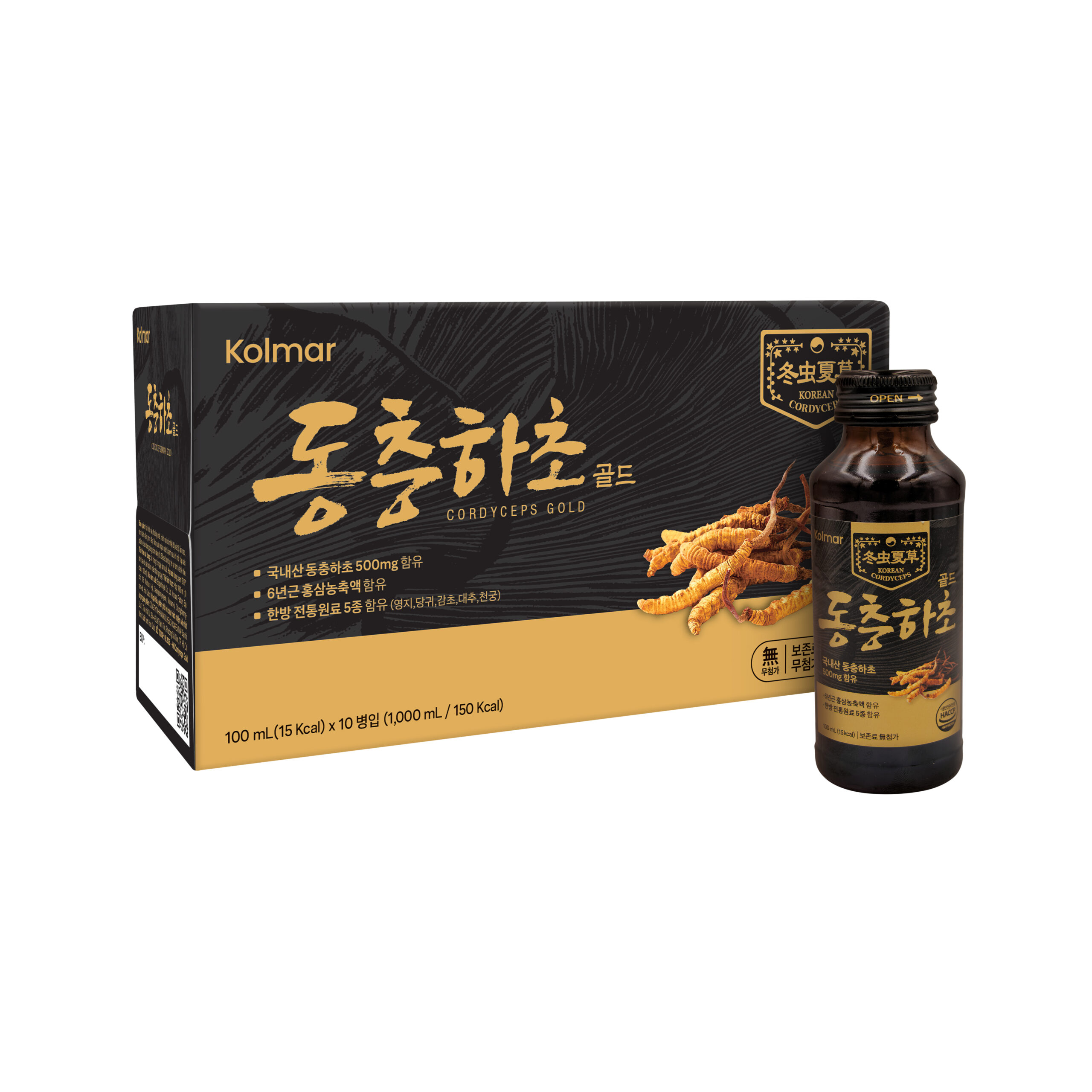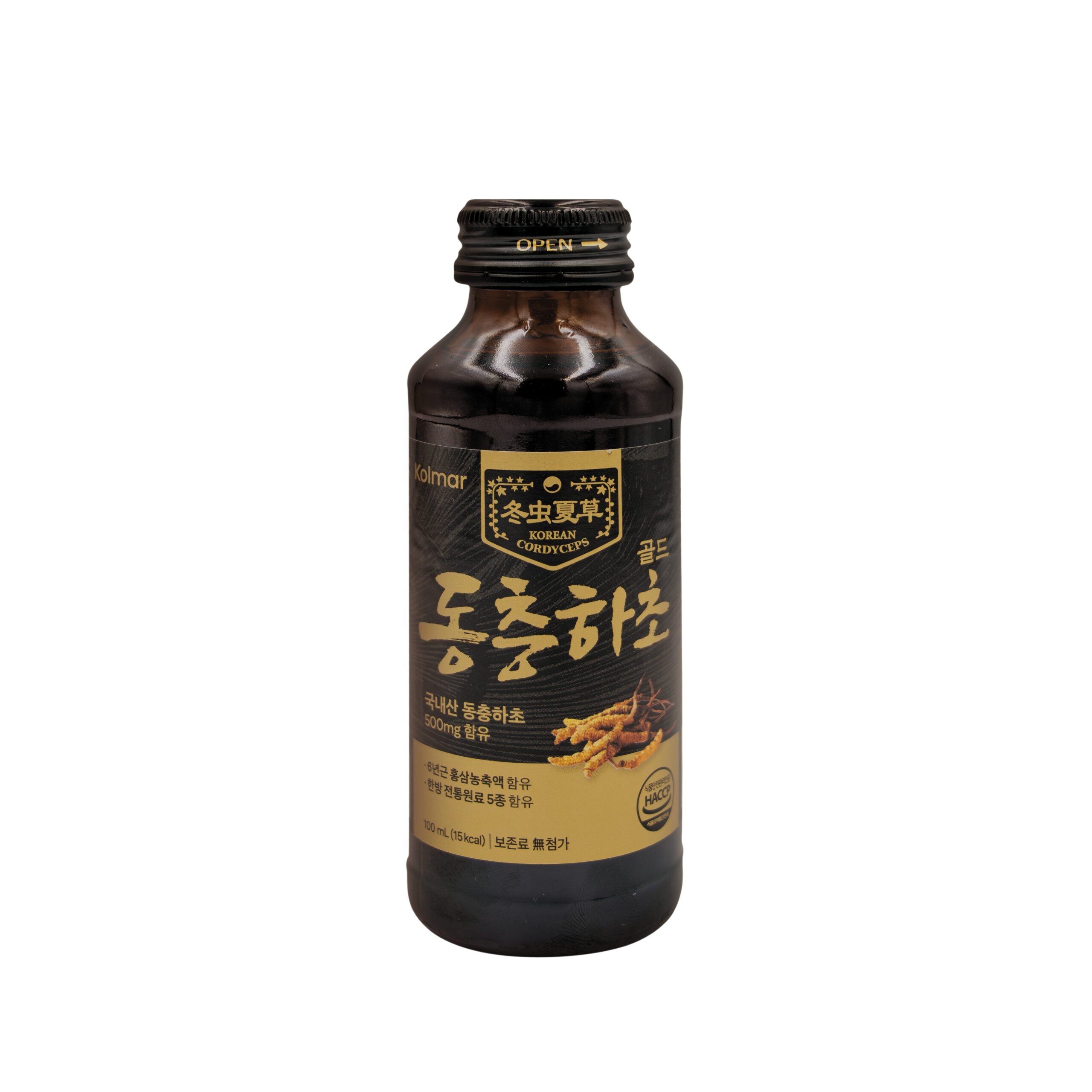Thành phần trong 1 chai 100 ml: Bột chiết xuất cô đặc đông trùng hạ thảo 500 mg, Nấm linh chi cô đặc 100 mg, Hồng sâm Hàn Quốc cô đặc 10 mg.