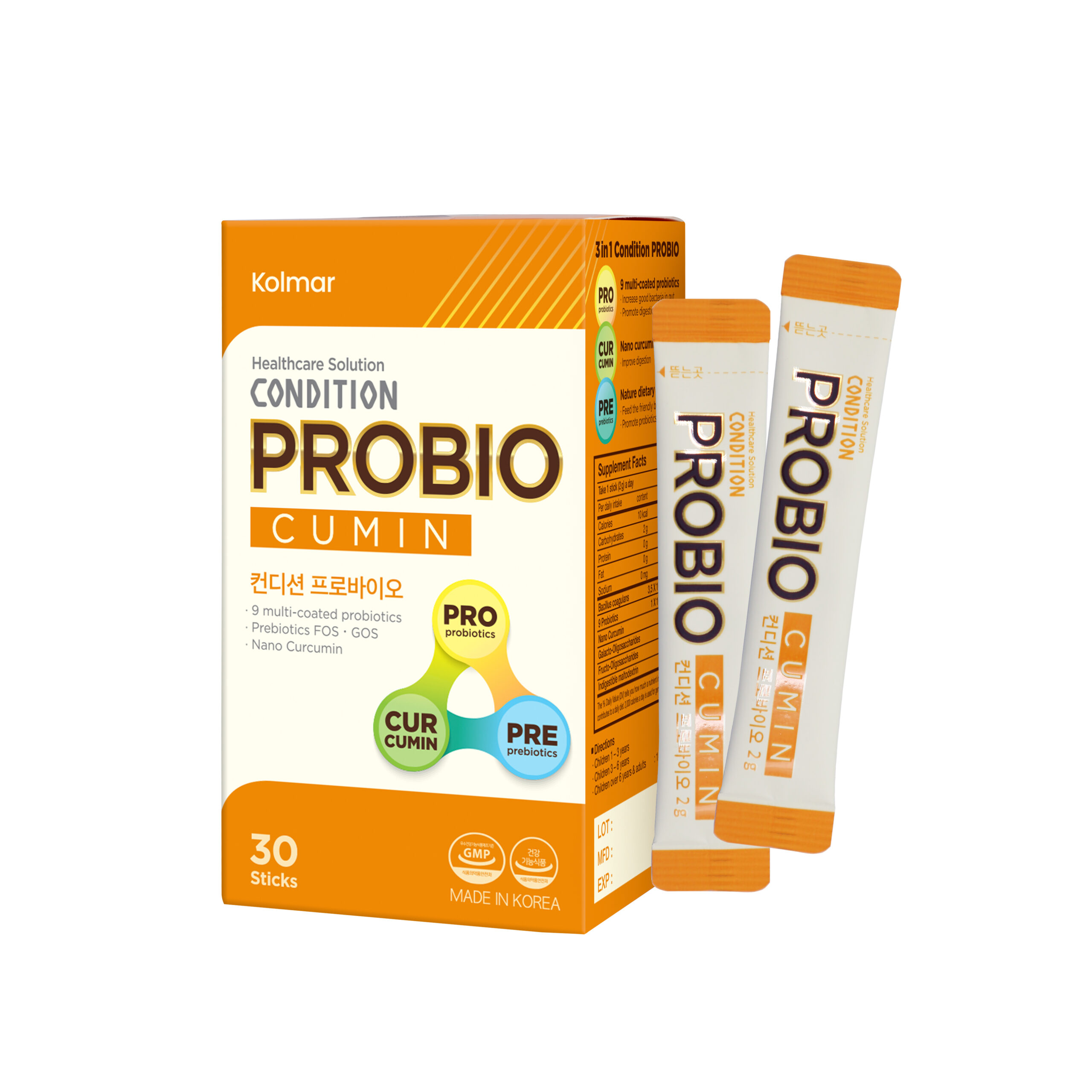 Thành phần: Trong 1 gói dạng bột có chứa: Bacillus coagulans ≥ 3,5×10⁹ CFU, Probiotics ≥ 1×10⁸ CFU [Gồm hỗn hợp 9 chủng lợi khuẩn (Lactobacillus rhamnosus, Lactococcus lactis, Bifidobacterium breve, Lactobacillus casei, Lactobacillus plantarum, Streptococcus thermophilus, Lactobacillus acidophilus, Bifidobacterium animalis spp. lactis, Bifidobacterium longum)], Fructo Oligosaccharide (FOS) 20 mg, Galacto Oligosaccharide (GOS) 20 mg, Nano Curcumin 20 mg, Indigestible Maltodextrin 20 mg.